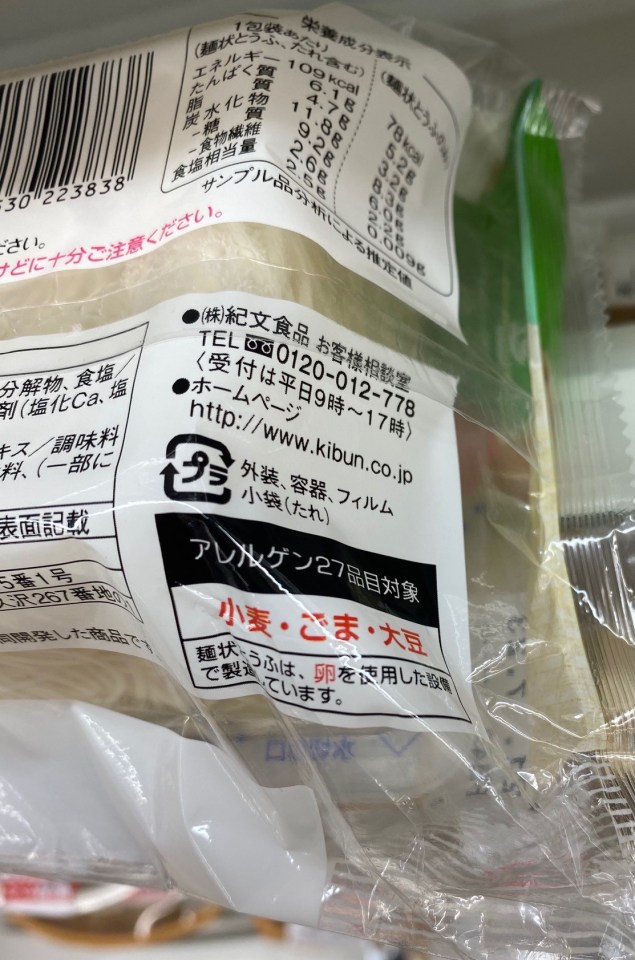 Family Mart, Mom’s Dining Room Kibun Tofu Noodles in Sesame Sauce, back of package allergy warning ← Previous Next → Like Loading...