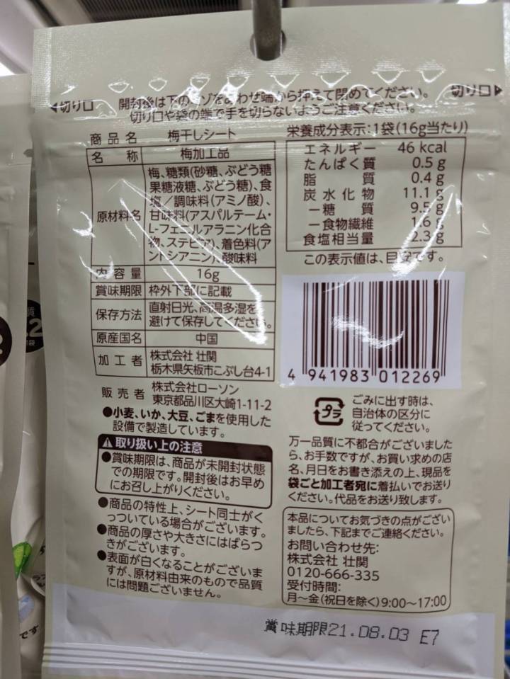 Lawson sheet shaped pickled plum back of package