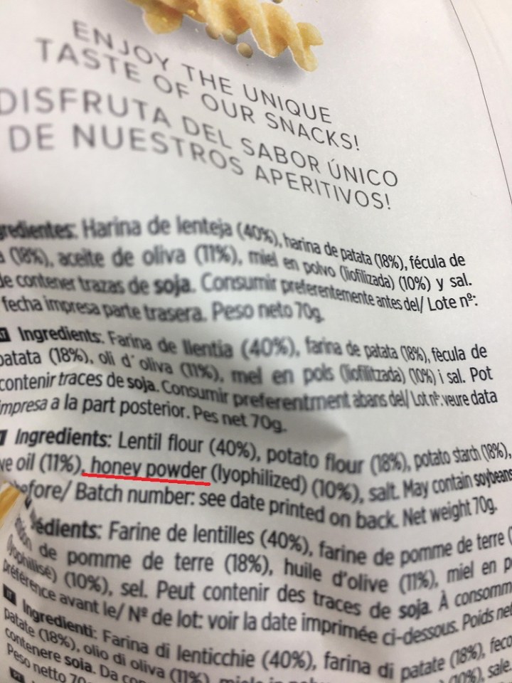 Torres Unique Snacks Lentil Twists with Honey ingredient list