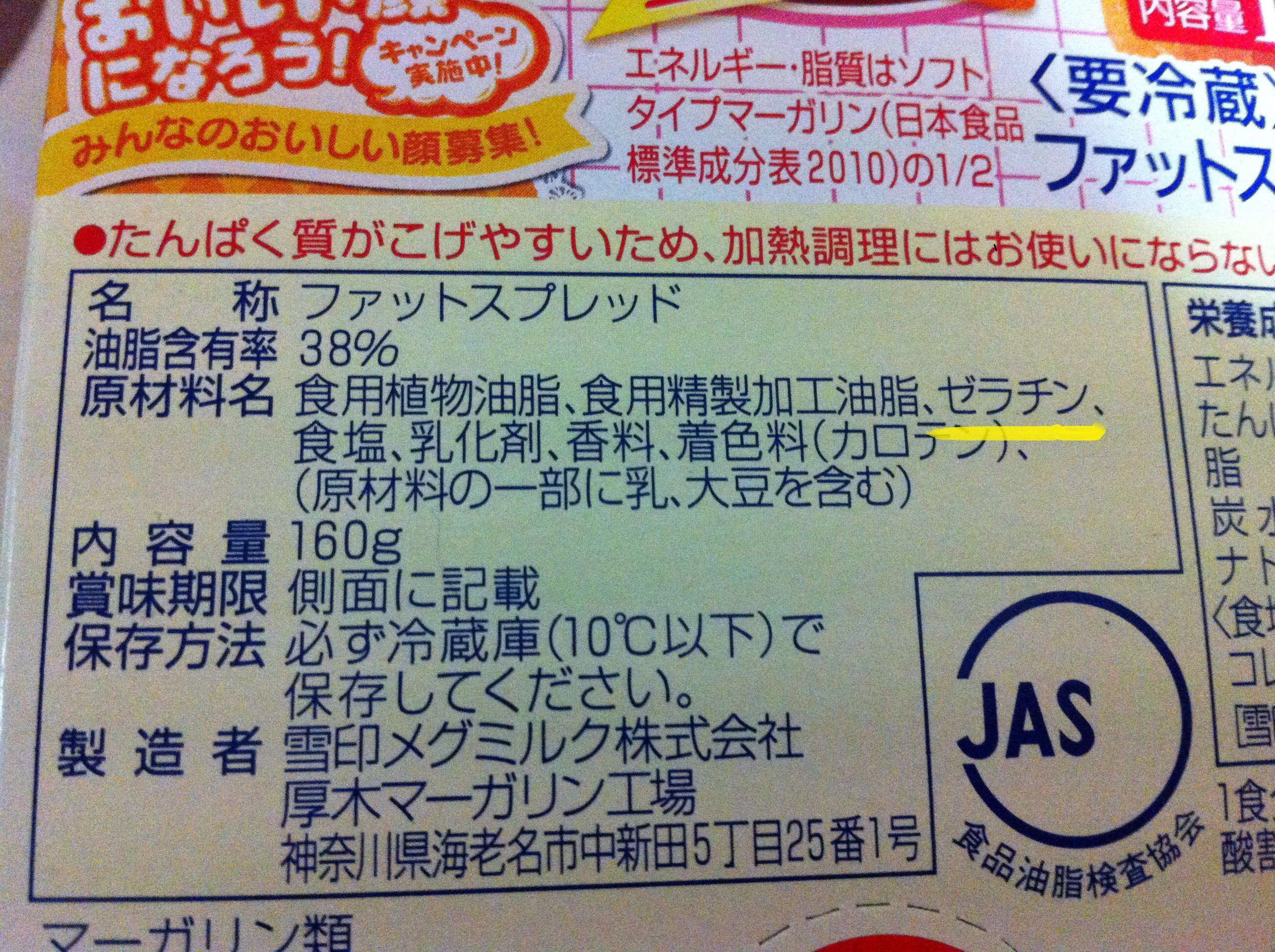 Vegan margarine is not the easiest thing to find in Japan, but there are a few options. We’ve listed them below. As always, dairy products and gelatin are the problem. Here is an example of regular margarine containing gelatin/ゼラチン/zerachin (the third ingredient):