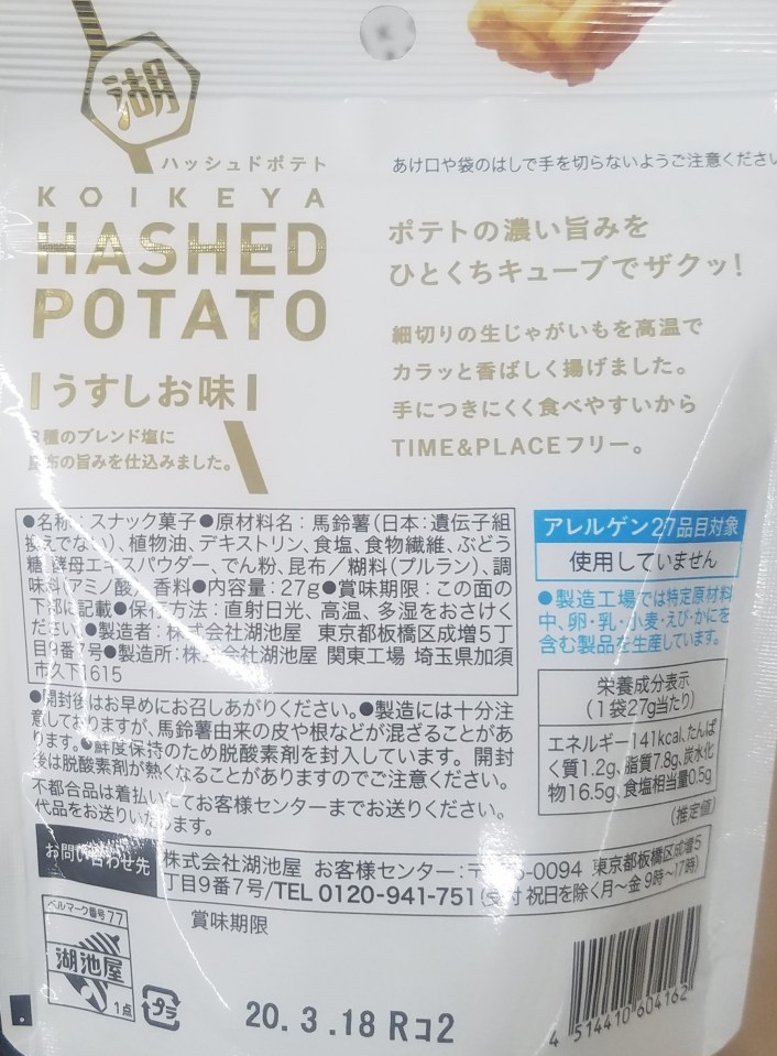 Kokeiya Hashed Potato back of package