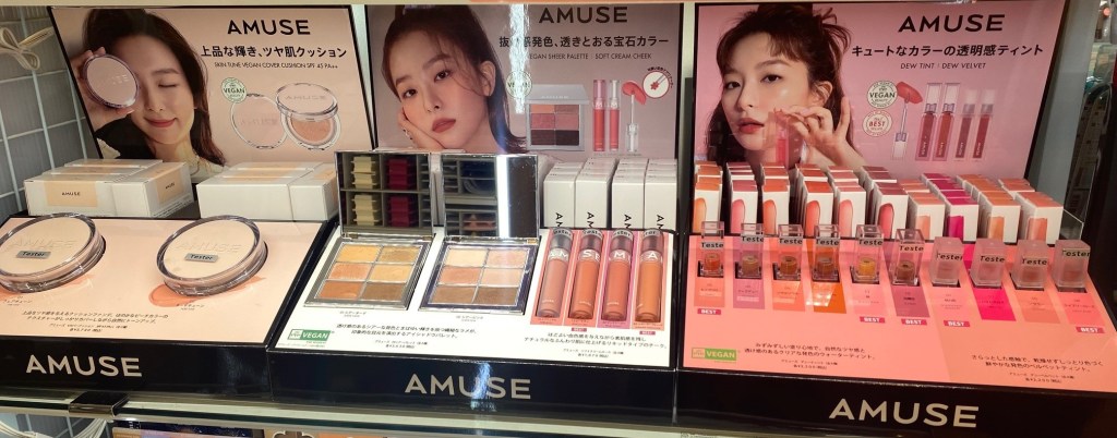 Amuse – the product “Skin Tune Vegan Cover Cushion” has EVE Vegan certification (Expertise Vegane Europe) (English). The English-language product page states that the formula and package are free of animal products or by-products and that it is 100% cruelty-free. They also have an EVE Vegan certified eyeshadow palette, the Eye Vegan Sheer Palette (English-language product page). The products appear to be sold mainly online, but they were also spotted in Champ de Herb, a chain makeup store, in November 2021.